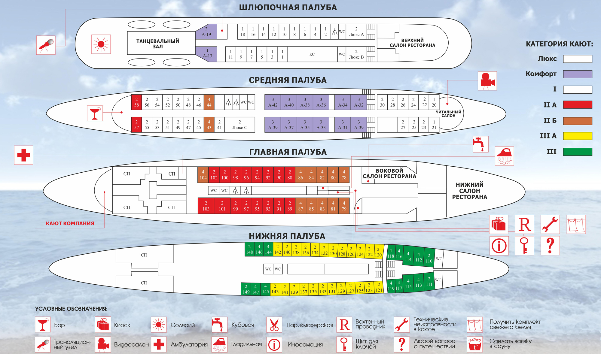 Люкс - двухместное размещение, телефон (обслуживание в каюте), шкаф для одежды, одноярусные спальные места, столик, мини-бар (за дополнительную плату), кондиционер, моноблок (жк-тв + dvd), радиоточка, зеркало, сан. узел, горячая и холодная вода.